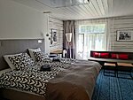 One family room is partially divided by a log partition, while the other is one large open space. All Superior rooms feature a king-size bed, a seating area with a sofa bed or armchair, a desk, a wardrobe, and a private bathroom. The floors are carpeted.