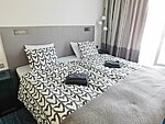 Each apartment features two separate bedrooms, a living room with a kitchenette, a bathroom with WC, and a terrace with summer furniture. One bedroom has a double bed, the other has two single beds. The living room includes a pull-out sofa bed for two. In total, the apartments can accommodate up to 12 additional guests.